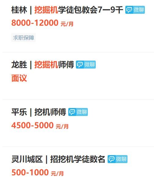 随着挖掘机行业势头的高涨,许多人投身于 挖掘机司机这一行, 学开挖掘机最主要的途径一个是从学徒做起,积累经验,一个是去 挖掘机司机培训学校学习。挖掘机学徒 一般工资不是很高,只是包吃包住,这也正常。毕竟是学习阶段,主要还是在一旁跟着师傅打打杂,观察怎么操作,偶尔体验一下亲自操作挖掘机。从学徒到成为一个能独当一面的 挖掘机机手,是一个循序渐进的过程,你需要学会每天的日常工作,打油,日常检查挖机,适应各种工况等,所以作为挖掘机学徒要认真学习,最重要的是好好积累经验,把技术弄得更娴熟以后出来工资才会更高。下面是小编在桂聘桂林人才网上面找的一些招聘信息,希望能帮到大家!