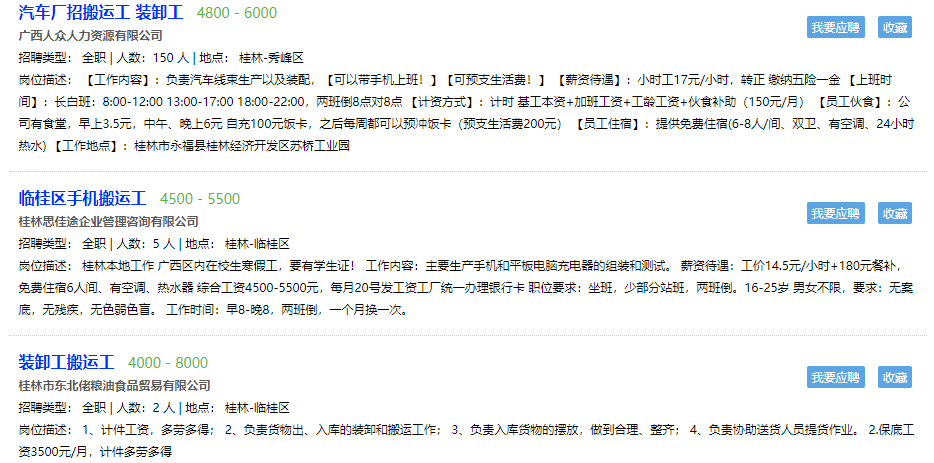 大家如果在桂林这个地方想当搬运工的话,我们要看一下桂林这个地方搬运工的工作是否有很多。每个地方的工作他们的要求都是不一样的。相信大家在找工作的时候呢,也希望找到了工作能够满足自己的一个要求。那么搬运工作的薪资是很高的。而且很多地方都是很不错的,所以大家在这样的一个形式也可以得到快速的得到薪资,同时,也能够快速的得到自己想要的公司。大家如果去找工作的话,可以去看一下这个工作。