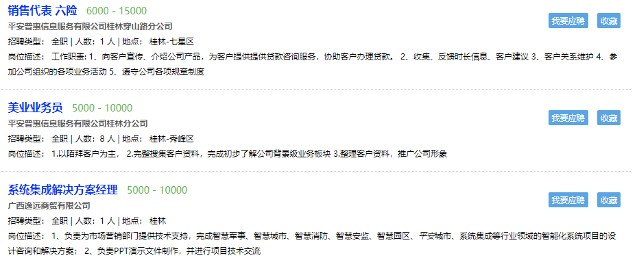 桂林这个地方有很多很不错的工作的。大家如果想去桂林这个地方工作的话,要看一下这个地方的工作是否适合自己。每个人找工作的时候其实都是有每个人自己不一样的要求的。也希望找到工作能够符合自己心中的一个想法。希望这样的一个工作能够带给一个能够带给自己很不错的体验感。毕竟工作做对每个人的生活都是很重要的,那么想去桂林的一些大型公司呢,其家要做好前期的准备,毕竟呢,大公司竞争也是很激烈的。
