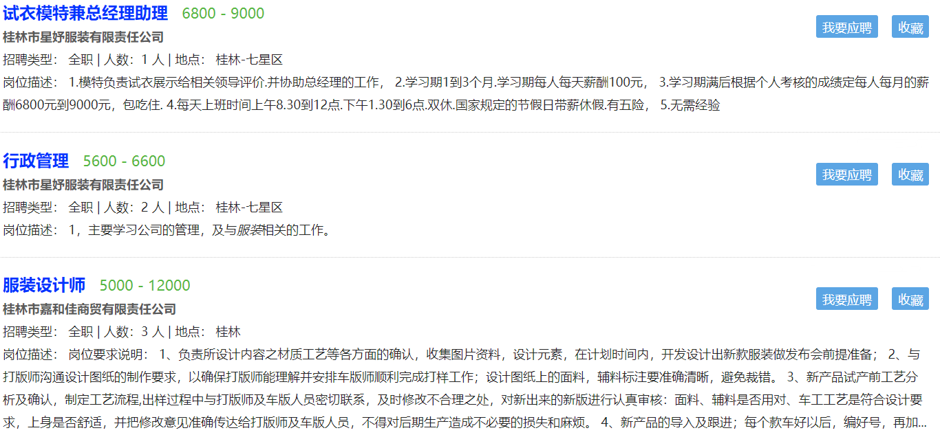 以上就是小编收集整理的有关桂林市服装店薪资待遇的全部内容,除此之外,小编还简单介绍了服装行业的发展前景以及桂林市的一部分服装店,希望可以帮助到有需要的小伙伴。在我们的日常生活中,衣食住行是必要的活动,因此,服装行业的发展前景是十分光明的,想要了解更多有关服装行业的内容,欢迎访问桂林人才网APP。