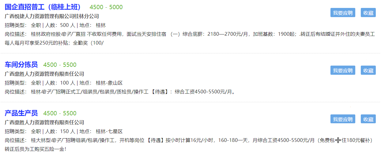 好啦以上就是小编为大家介绍的有关桂林有几个电子厂和电子厂平均薪资以及工厂普工上班时间是相关内容啦。小编觉得桂林是一座非常美妙的城市,它不仅山水迷人而且这里的人都是十分亲切的。而且桂林经济发展的也还可以虽然没有一线城市那样的发达。希望以上的内容对大家都能够有所帮助。如果有小伙伴想要了解更多有关桂林电子厂招聘的信息可以上桂林人才网APP哦!
