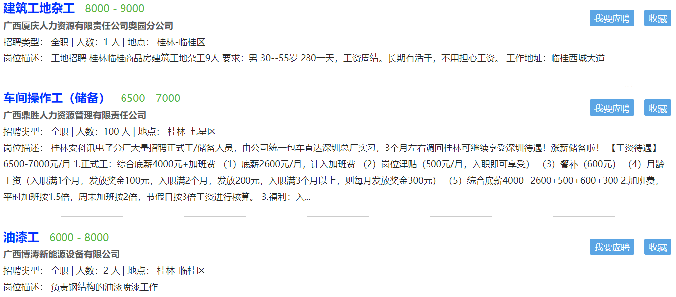 以上就是小编收集整理的有关桂林市普工招聘信息的全部内容,除此之外,小编还简单介绍了桂林市生产普工的薪资待遇以及桂林普工的招聘信息,希望可以帮助到有需要的小伙伴。桂林市普工的薪资是相对不错的,能够适合生存下来,在好的工厂可以拥有更好的待遇,想要了解更多有关桂林市普工的内容,欢迎访问桂林人才网APP。